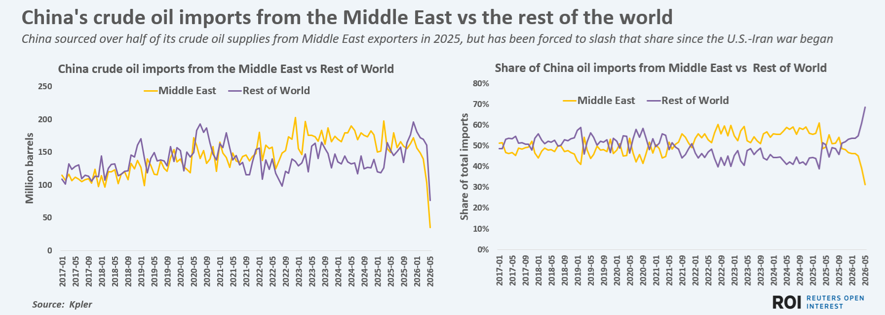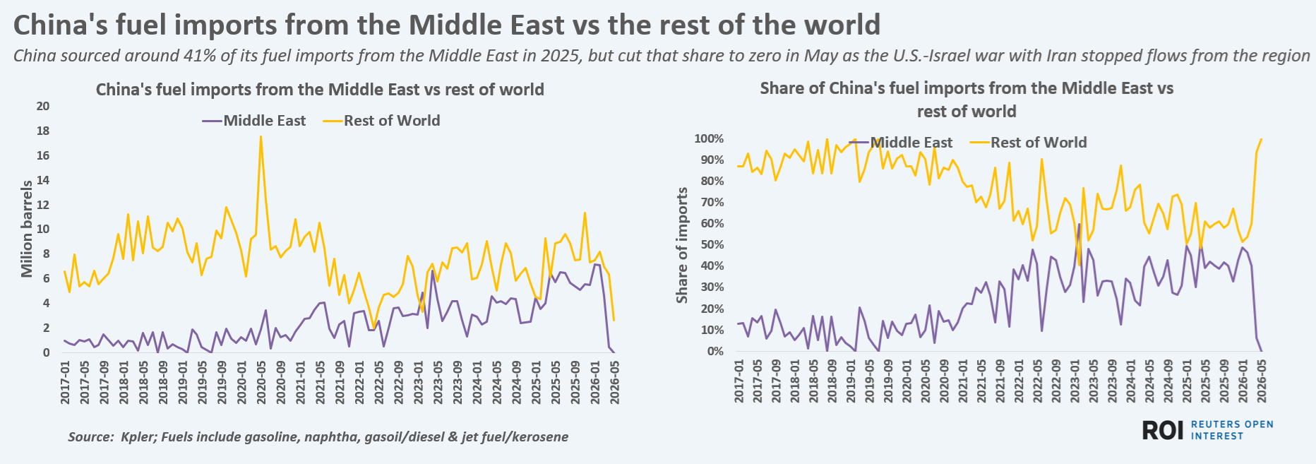 Middle Eastern suppliers accounted for around 41% of China's total refined product imports in 2025, but supplied less than 1% in May, according to Kpler, following the closure of shipping lanes.