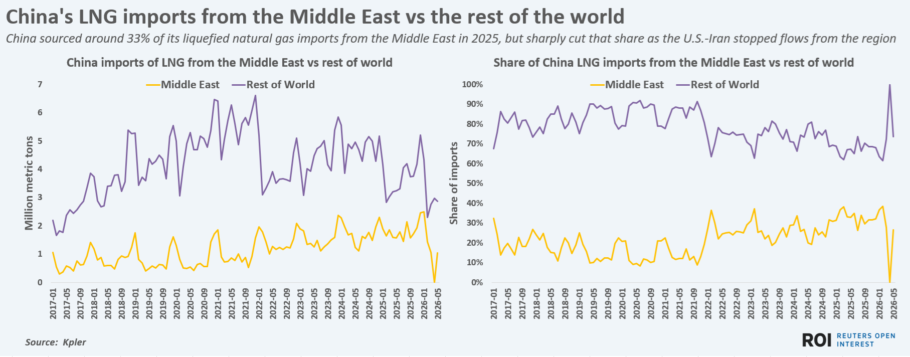 In LNG, total exports from the Middle East to China during January to May are estimated around 6 million tons, which is around 2.5 million tons or around 30% less than during the same months in 2025.